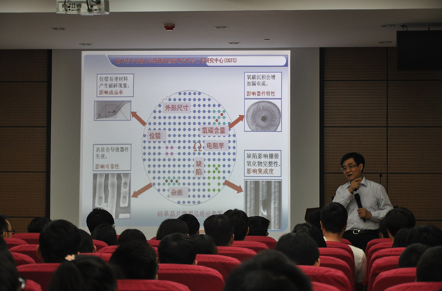 刘丁教授首先重申了今天讲座的主要内容和意义,希望同学们通过此次讲座,能够开拓眼界并且了解相关产业的发展现状。刘教授先介绍了硅单晶的基础知识,让同学们能够有个大致的了解,举例说明了硅的重要作用。以摩尔定律为引,强调了半导体材料的发展以及集成电路的发展支撑了信息化时代的发展。指出集成电路产业的发展已成为国家重点发展战略。刘教授指出“工业时代最基础最重要的产品是钢铁,信息时代最基础最重要的产品是芯片“。接着介绍了多晶硅到硅单晶的工艺难度及最常用的方法:直拉单晶制造法(CZ法)。从宏观角度到微观角度分析了硅单晶的制作要求及难度。引申到自己的研究项目中深入浅出的介绍了整个流程的主要任务及目标。并希望更多员工能够加强学习不能局限于专业课程的学习,要了解相关产业的技术及学科研究,将来能够投身到该行业的发展及研究中来。