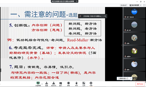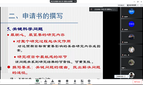 夏银水教授结合自身丰富的国家基金申请和评审经验,从国家自然科学基金项目申请书的题目、中文摘要、成员组成、立项依据、国内外研究现状和发展动态、研究内容、研究目标、关键科学问题、研究方案及可行性分析、特色和创新之处、预期研究成果、研究基础及工作条件等14个方面给出了具体的撰写建议和注意细节,结合部分实例进行了详细的解读和分析,并指出了许多常见的认识误区。报告会期间,夏教授与参会教师进行了热情互动,解答了教师提出的问题。