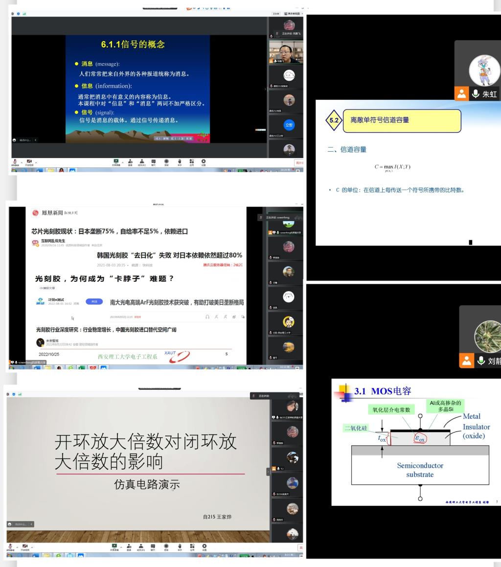 朱虹教授主讲《信息论与编码基础》课程,精选教学案例,采用启发式、互动性教学,充分调动员工在线学习积极性。封先锋老师针对《微纳加工工艺》课程,精心设计“课程思政”教学案例,既突出了专业课教学的特点,又巧妙引入员工思想品德教育,实现了“润物无声”的教学效果。刘静老师在《微电子技术基础》课程的教学中,对于知识点的讲解严谨细致,既关心线上员工状态,又采用多种形式互动,实现了教学效果最佳化。吴鹏飞老师在讲授《电路、信号与系统》课程时,内容设计巧妙精彩,教学感情强烈融入,让员工深受感染。尹军老师在《模拟电子技术基础》课程教学中,采用“翻转课堂”的教学方式,由员工分享电路仿真过程,获得了良好的教学效果。