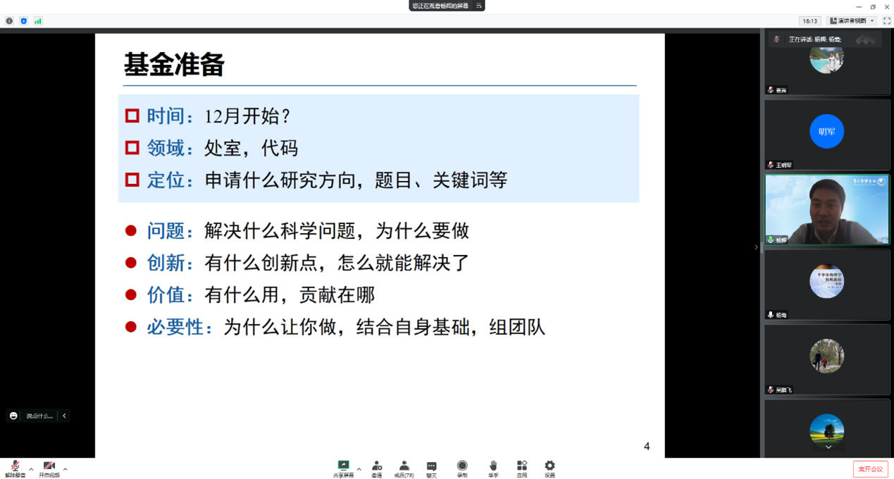 杨辉教授结合自身申报国家基金的经验,首先对国家自然科学基金准备的时间、领域、定位、问题、创新、价值及必要性做了详解,然后从项目申请书的题目、摘要、立项依据、研究内容、研究目标、关键科学问题、研究方案及可行性分析、特色和创新之处、研究基础及项目经费与其他事项等方面给出了具体的撰写建议和注意细节,也总结了自己作为评审人在同行函评过程中的一些感想,以及需要规避的常见错误。杨教授希望大家在吃透申报指南的基础上对申请书进行反复凝练、修改打磨。最后,杨教授分享了自己申请国家优青的经验,鼓励大家积极申报人才类项目。