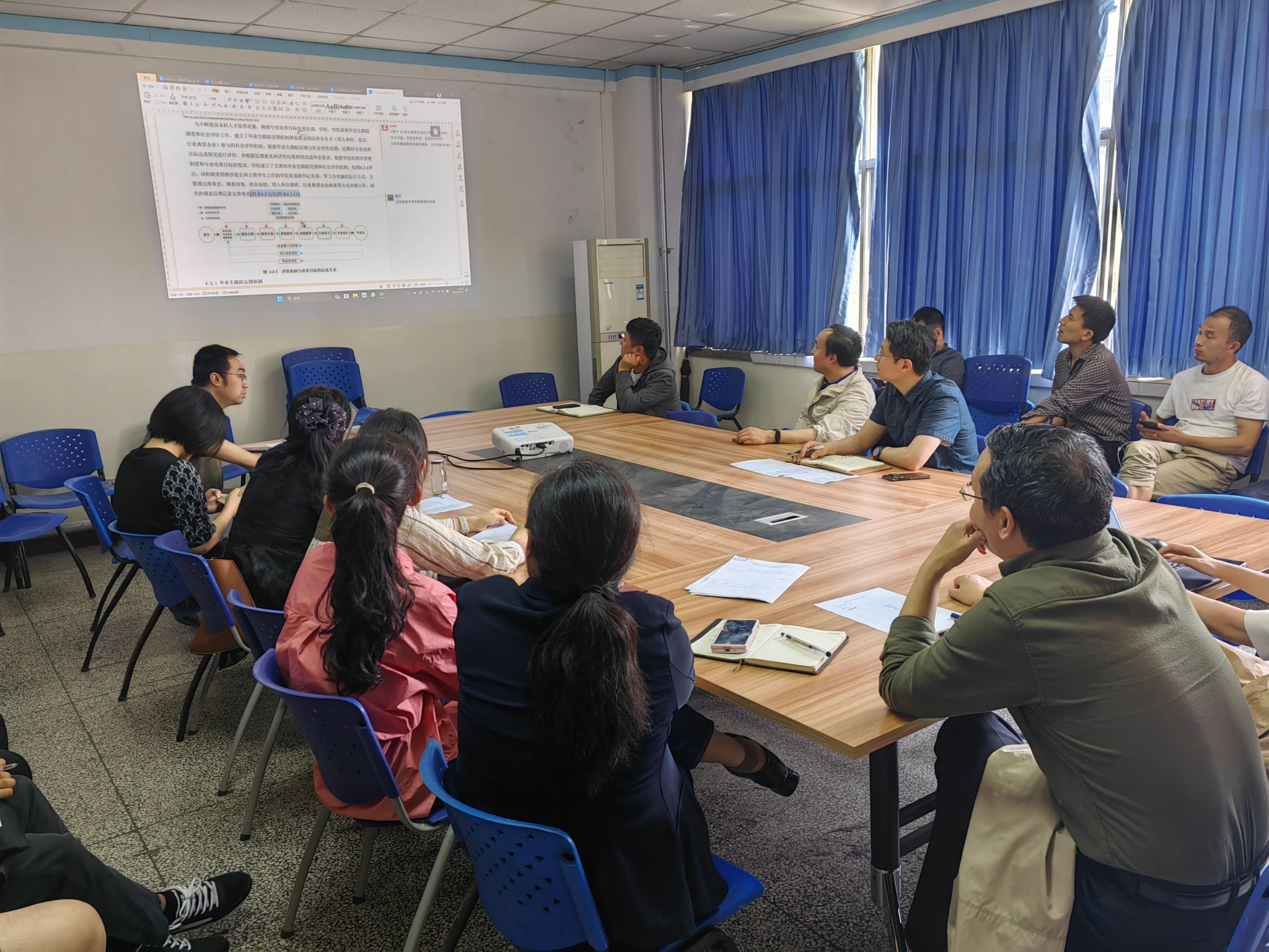 系教学主任姚俊良对照专业认证标准,从培养目标、毕业要求、持续改进、课程体系、团队队伍、支持条件、质量保障以及员工发展等方面汇报了认证报告撰写最新进展情况。随后,自评报告各模块撰写负责人认真梳理、总结了上一阶段认证工作总体进度和存在的主要问题,对当前认证工作中的重点和难点进行了研讨,并提出了解决思路与对策。
