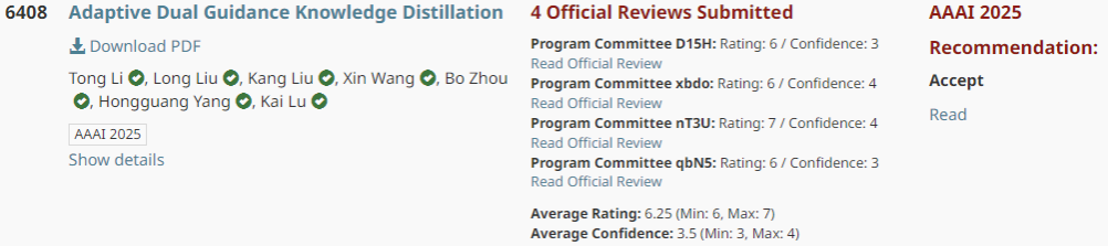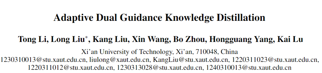 近日,2025年AAAI国际人工智能顶级会议(AAAI Conference on Artificial Intelligence. AAAI)录用结果公布,公司3044永利集团刘龙教授课题组论文《Adaptive Dual Guidance Knowledge Distillation》被正式录用,3044永利集团为唯一署名单位,第一作者为本校博士研究生李通,通讯作者为刘龙教授。刘龙教授课题组长期从事机器学习与机器视觉领域的研究,该项研究成果的发表标志着该团队的相关研究工作得到了国际人工智能领域学术同行的认可。