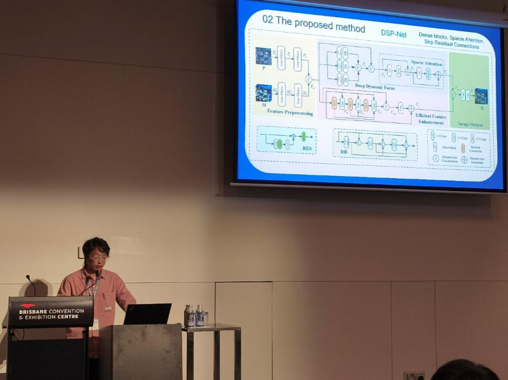 以团队王文卿副教授为第一作者完成的研究论文《Dual-branch pansharpening network via skip dense residual and sparse attention》被IGARSS 2025接收,硕士生高铭泽进行口头报告。