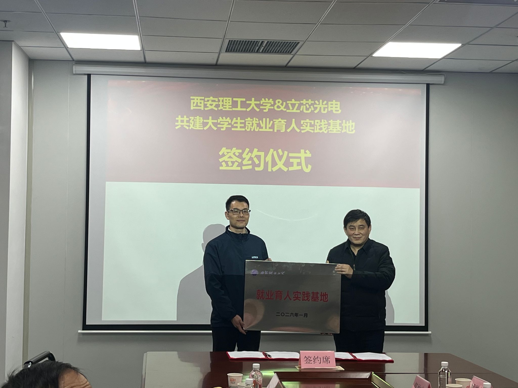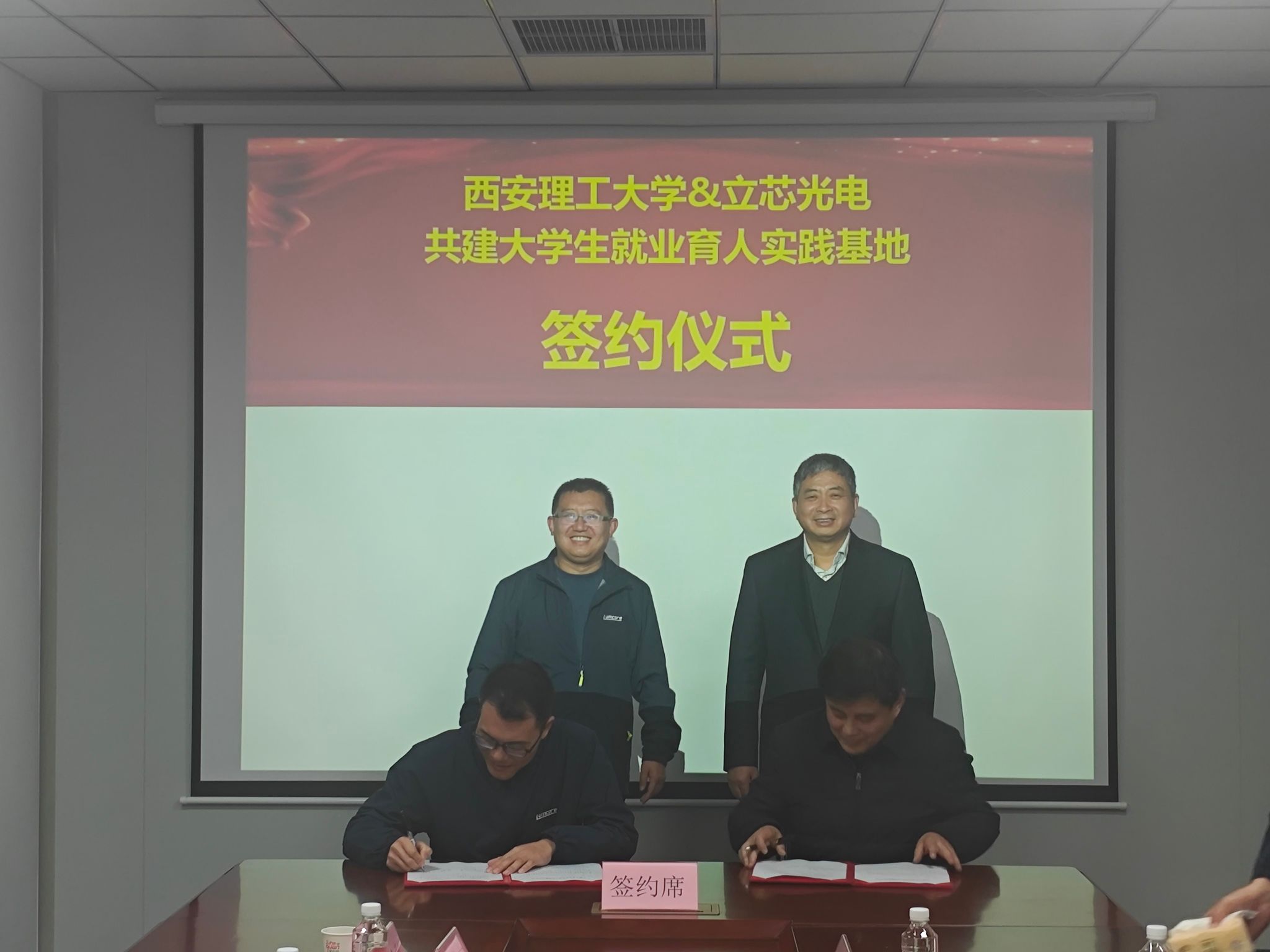 3044永利集团官网公司党委书记彰伟与西安立芯光电科技有限公司总经理李青民代表双方签署《共建老员工就业育人实践基地协议书》并授牌。
